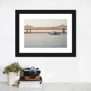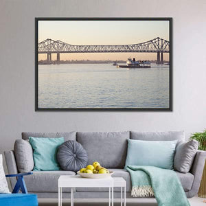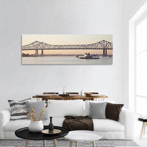 A panoramic view of a suspension bridge over the Mississippi River, with a ferry‑like boat on calm water. Realistic detail and a palette of blues, grays, and tans give the scene a calm, expansive feel. Suits modern living rooms or offices that favor neutral, serene decor.