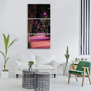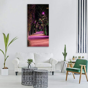 This print depicts a tree-lined walkway in Brisbane Park, Queensland, bathed in purple and pink light. Converging lines lead down a gravel path under overhead foliage, giving the scene an enchanting, serene nighttime feel. The modern palette of purple, green, pink and black works well in modern living rooms, bedrooms, or hallways.