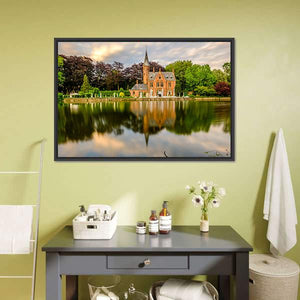 Minnewater Lake in Bruges presents a serene lakeside view with a castle, trees and a mirror-like reflection that feels picturesque and quietly historic. The image’s symmetrical composition and a palette of greens, blues and warm browns create a calm, natural atmosphere. This canvas suits rooms that favor nature-focused or classic place-themed wall decor such as living rooms or studies.