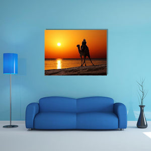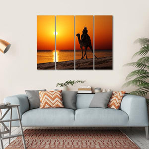 This canvas wall art captures the serene beauty of a sunset in the desert, featuring a striking silhouette of a camel and rider. The warm palette of orange, yellow, and brown evokes a tranquil atmosphere that enhances any space.