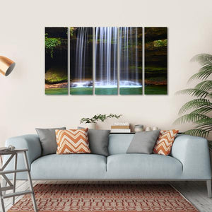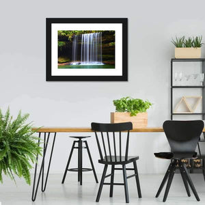 Experience the serene beauty of a cascading waterfall surrounded by rocky cliffs and lush forest. This canvas art captures a tranquil natural scene, inviting calmness into your space.