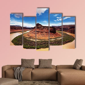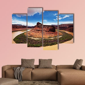Canyonlands National Park canvas shows horseshoe bend, a sediment-rich river, layered canyon rock formations and clouds in a wide-angle landscape. The orange, brown, green, blue and white palette gives a grand, natural, awe-inspiring mood. It fits modern homes and room decor that favor landscape wall art.