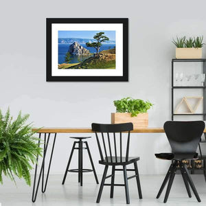 Desires Tree shows a lone tree on a hill beside a wide lake, with a prominent rock formation and distant mountains. The wide-angle nature photograph in blues, greens and earth tones feels serene and grand. A panoramic canvas print suited to modern living rooms or offices as calm, natural wall decor.