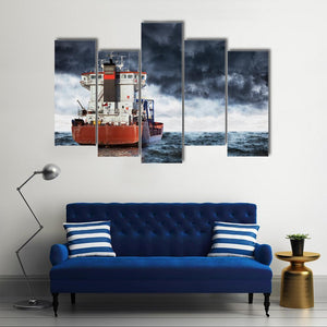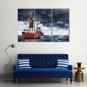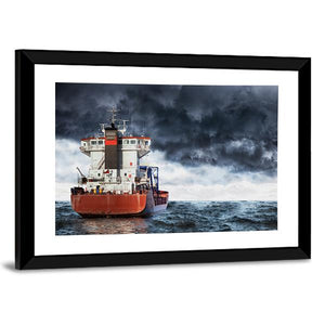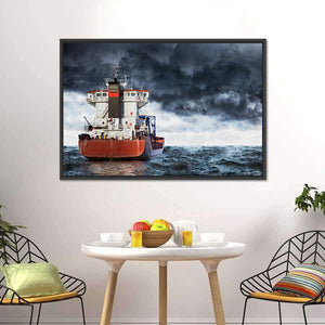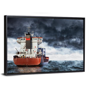 Cargo Ship Under Clouds Canvas Wall Art presents a centered, eye-level view of a cargo ship moving through a stormy sea beneath dark, textured clouds. The realistic palette of blues, grays and touches of orange gives the scene a dramatic, turbulent mood. Suited for modern homes, it makes a bold statement as room decor in living areas or entryways.
