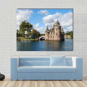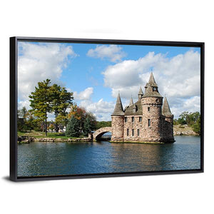 This canvas print features a picturesque stone castle with towers, nestled on Heart Island. A serene river flows peacefully beneath a stone arch bridge, framed by lush trees and a partly cloudy sky, creating a historic and tranquil atmosphere.