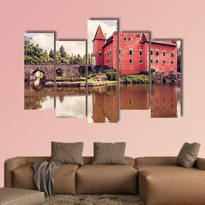 Cervena Lhota Castle Canvas Wall Art depicts the red castle beside calm water, framed by trees and an arched stone bridge. The vintage, picturesque scene feels serene and historic, with soft reflections that suit vintage or modern living spaces.