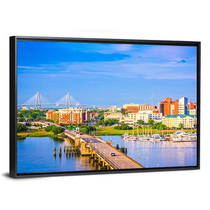 Charleston Skyline & Ashley River Canvas shows a photorealistic, wide-angle view of the city skyline, suspension bridge, and boats docked along the harbor. The scene reads vibrant and sunny—blue, orange, white, and green tones with calm water reflecting the riverside activity. It suits room decor in living rooms, entryways, or modern homes.