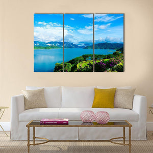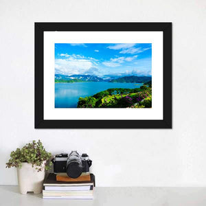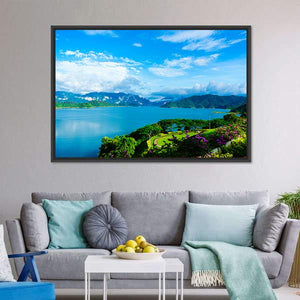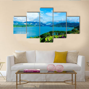 Cheow Lan Dam Canvas Wall Art shows a panoramic lake at Cheow Lan Dam in Thailand, framed by mountains, lush greenery and a blue sky with white clouds. Photorealistic detail—purple flowers in the foreground and a winding path on a green hill—creates a serene, tranquil and vibrant mood that suits modern living rooms or offices.