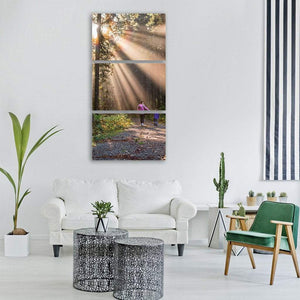 A child and mother walk a sunlit forest path, captured in a realistic nature style with deep greens, warm browns and golden highlights. The scene feels serene and hopeful, with sunbeams and light dust particles creating an ethereal, tranquil atmosphere. It works well as room decor in modern, nature-inspired spaces.