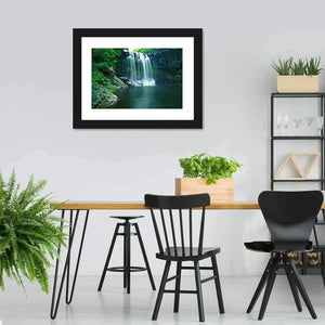 Experience tranquility with this enchanting waterfall scene, depicting lush green foliage and flowing water in a serene palette of greens and blues. This nature-inspired canvas captures the beauty of its surroundings, perfect for bringing a touch of calm into your home.