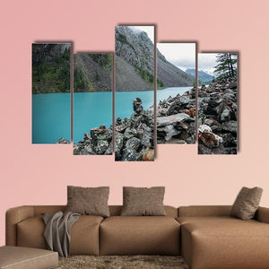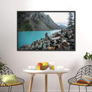 Rock cairns and a turquoise mountain lake in Altai, Russia are captured in a quiet nature photograph that feels serene, wild, and remote. The detailed foreground and vast distant mountains make this print a calm, natural focal point for modern or nature-themed rooms.