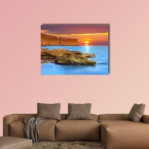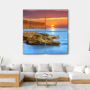 Capture the beauty of the ocean with this serene canvas art featuring a stunning sunset over jagged cliffs and tranquil waters. The harmonious blend of blues, oranges, and yellows creates a peaceful atmosphere, perfect for any modern décor.