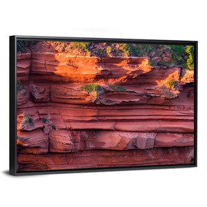 This canvas captures the beauty of layered sandstone cliffs with a close-up view that highlights their natural textures. The warm palette of reds, oranges, and greens evokes a geological landscape that brings the outdoors into your space.