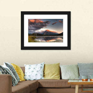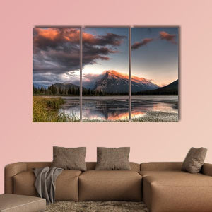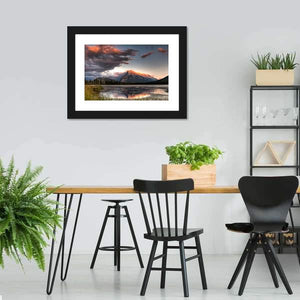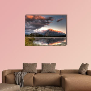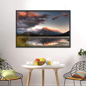 A realistic landscape canvas showing clouds moving over a mountain peak beside a calm lake, with trees along the shore. Warm oranges and cool blues, paired with dramatic lighting and a rule-of-thirds composition, create a serene yet majestic mood. Suits modern living rooms or bedrooms that favor nature-inspired wall art.