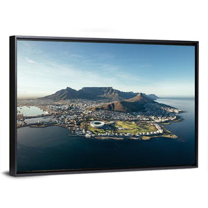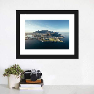 This panoramic canvas captures the serene beauty of Cape Town, showcasing a breathtaking blend of ocean and mountain views. The photorealistic depiction features the iconic Table Mountain, creating an expansive atmosphere perfect for enhancing any space.