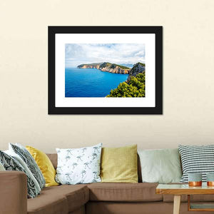 Coastline Of Lefkada Island presents rocky coastal cliffs and clear blue water in a panoramic seascape that feels serene and expansive. The realistic nature palette of blue, green, brown, and white fits modern or coastal room decor.