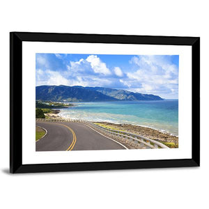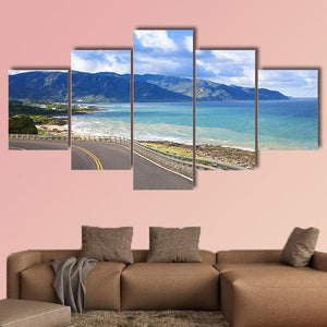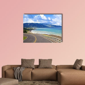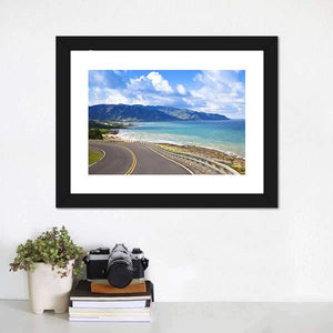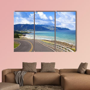 A realistic landscape of Kenting National Park, this canvas captures a curving coastal road, choppy ocean waves and distant mountains. Muted blues, greys and a hint of yellow line the road to create a serene yet adventurous mood—suitable for modern living rooms or travel‑inspired spaces.