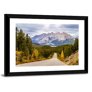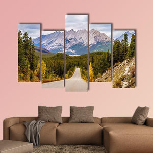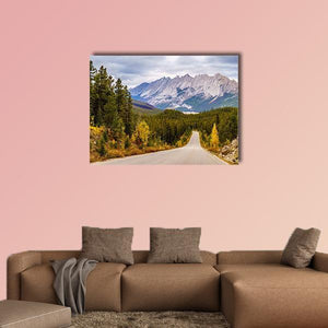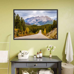 This canvas shows a winding asphalt road through tall evergreen forest toward snow-capped mountains, setting a peaceful, adventurous mood. The realistic landscape uses greens, browns, grays, and blues with leading lines and a clear vanishing point—suitable for modern home decor and room displays.