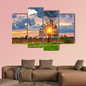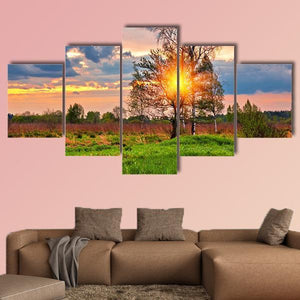 Sunset In Summer Field shows a realistic summer landscape with a tree, open green field and the sun peeking through the branches beneath a blue-orange sky. The scene reads as serene, peaceful and warm, and suits modern home room decor such as living rooms or bedrooms.