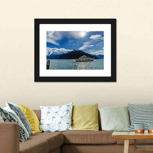 This canvas wall art captures a serene scene of a cruise ship gliding on Lake Lucerne, surrounded by majestic mountains. The realistic portrayal features a soothing palette of blues and greens, evoking a peaceful atmosphere perfect for any nature lover's space.