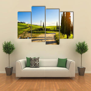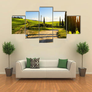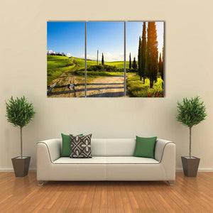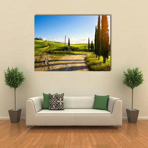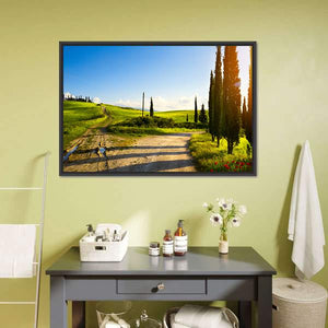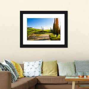Cypress Trees On Mountain Canvas captures a winding country road through rolling hills dotted with cypress trees and farmland beneath a blue sky. Late-afternoon sun flares, puddles on the dirt road, and shadows cast by the trees give the scene a serene, peaceful, idyllic mood. It suits rustic or nature-inspired rooms and brings a calm, pastoral touch to home walls.