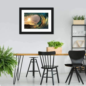 Experience the awe-inspiring beauty of ocean waves and sunsets with this photorealistic canvas art. The dramatic perspective captures sunlight dancing on the crest of the wave, creating a serene yet powerful atmosphere that evokes the tranquility of a tropical island.