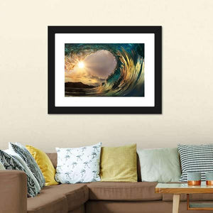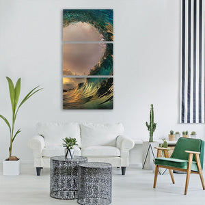 Experience the dynamic beauty of an ocean wave captured in a vertical canvas art piece. This artwork showcases translucent water with sunlight filtering through, evoking a powerful and breathtaking atmosphere that enhances any space.