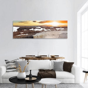 Dettifoss Waterfall Panoramic Canvas Wall Art shows a wide, natural sweep of a waterfall at sunset with snow-dusted ground and rocky foreground beneath a bright low sun. The panoramic, naturalistic scene in orange, brown, white and blue tones reads as dramatic yet serene and fits modern living rooms or offices.