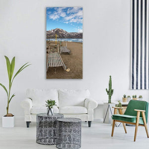 Dog Sled In Summer Canvas shows a quiet, realistic mountain landscape with a dog sled, snow-capped peaks, wooden benches, and calm water. The panoramic scene uses blues, whites, browns, greens, and greys to create a serene daytime mood. It fits nature-themed or modern room decor.