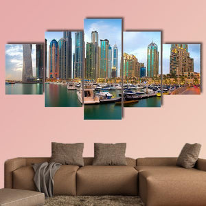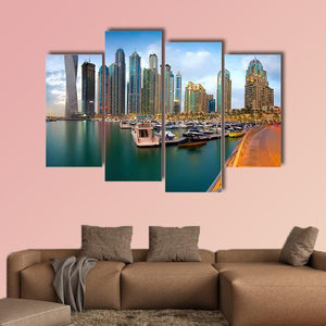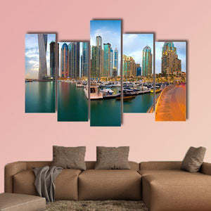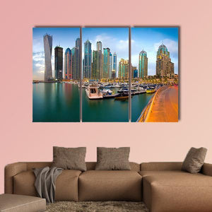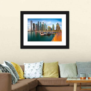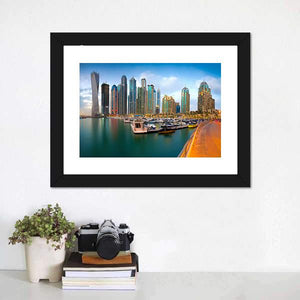 Dubai Marina Canvas Wall Art shows the Dubai Marina skyline with yachts and reflective water beside an orange waterfront pathway. The photorealistic image conveys a vibrant, modern, bustling daytime city scene. It fits well in contemporary homes and modern-style rooms like living rooms or offices.