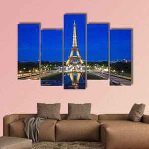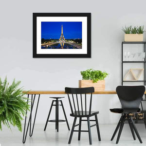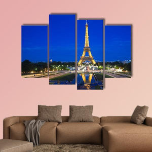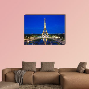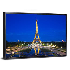 A photorealistic view of the Eiffel Tower in Paris, illuminated against a blue night sky. Symmetric composition centers the tower amid fountains and gardens, with golden city lights creating an iconic, celebratory mood. This canvas fits modern living rooms, entryways, or travel-themed spaces.