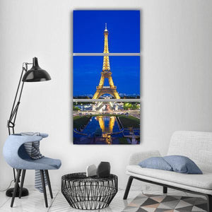 This photorealistic canvas shows the Eiffel Tower illuminated at night, its lights mirrored in reflective pools of water. A centered, symmetrical composition and a blue-and-golden palette give the scene an elegant, iconic nocturnal mood. Works well with modern room decor like living rooms or bedrooms.