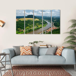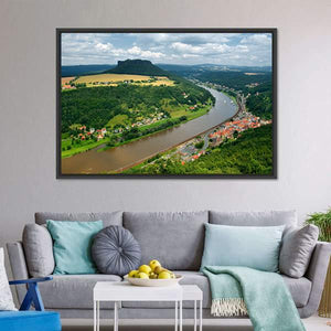 This beautiful canvas art captures the serene Elbe River in Germany, with an aerial view showcasing vibrant green trees, red-roofed buildings, and boats gently gliding on the water. Its scenic colors and realistic style invite a peaceful atmosphere, making it a lovely addition to nature-themed décor.