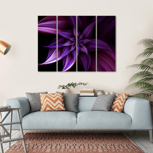 This abstract canvas features a captivating purple flower, embodying an ethereal and dark mood. The interplay of symmetry and negative space, combined with glowing highlights and petal-like fractal shapes, makes it a striking addition to any contemporary decor.