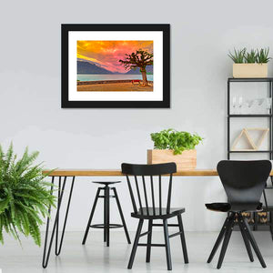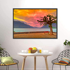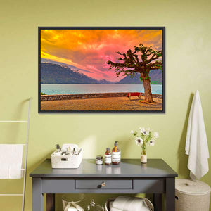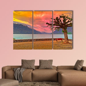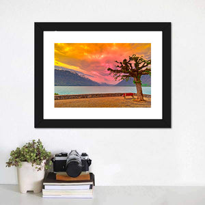Lake Brienzer At Sunset shows a lakeside landscape with a gnarled tree, a red bench, snow-capped mountains and calm water at dusk. The vibrant orange, pink and blue palette and rule-of-thirds composition create a dramatic yet serene mood, suited to modern living rooms or nature-inspired spaces.