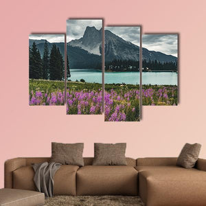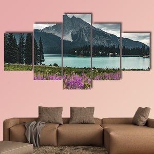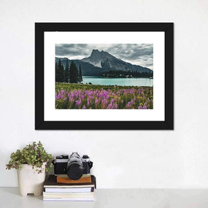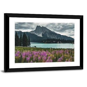 A realistic landscape showing an emerald lake beneath towering mountains, edged with wildflowers and stands of evergreen trees and small houses along the shore. Stormy clouds gather overhead; a cool palette of blues, greens, purples, and grays gives the scene a serene, majestic, and peaceful mood. Works well in modern or nature-themed rooms as a calm focal point.
