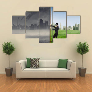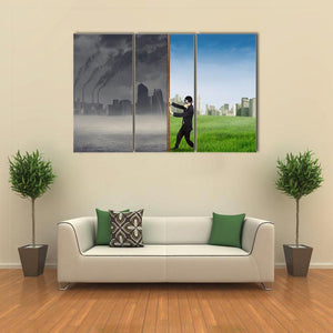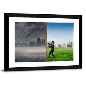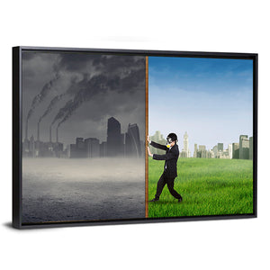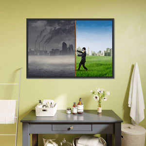This canvas art explores the contrast between pollution and nature, featuring a man in a suit pushing a dividing line. The modern design blends shades of gray, blue, and green, creating a hopeful and symbolic atmosphere.