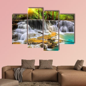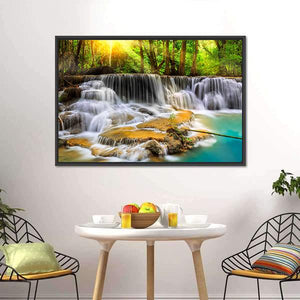 Erawan Waterfall in Thailand presents a serene, vibrant nature scene with rushing water, mossy rocks and sunbeams filtering through the forest canopy. The composition emphasizes depth and natural greens, blues, whites and warm browns for a calm, lively atmosphere. It works well as room decor in nature-inspired or modern canvas art settings.