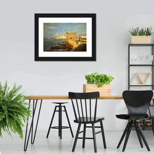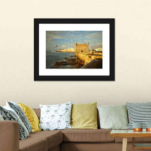 This panoramic canvas shows the coastal fortress of Essaouira with the sea and flying seagulls, rendered in a realistic, historic style. Blue and ochre tones highlight the weathered stone castle and daylight atmosphere, making it a natural fit for modern or coastal-inspired living rooms and hallways.