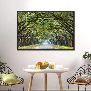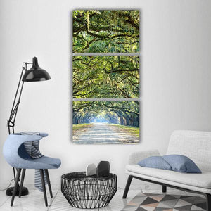 A canvas print of a tree-lined road draped in Spanish moss, with sunlight filtering through oak branches. The vanishing-point perspective and green, brown, and gray palette create a serene, majestic, inviting atmosphere. Suited to modern or nature-themed rooms such as living rooms, hallways, or entryways.