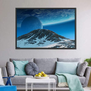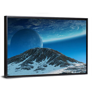 A panoramic canvas of a sharp, snow-covered mountain beneath two exoplanets and a wide, expansive sky. Rendered in blue, white, grey, and black, the image feels vast, serene, and otherworldly — a good fit for modern or sci-fi‑themed room decor.