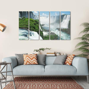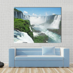 This canvas wall art captures the breathtaking Iguazu Waterfall, showcasing multiple cascading falls surrounded by lush greenery and towering cliffs. The powerful yet serene scene evokes a sense of majesty and connection with nature.