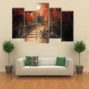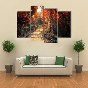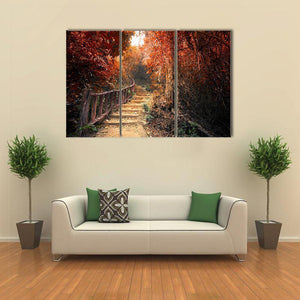 This canvas art features a serene forest path adorned with golden foliage and sunlight filtering through the trees, creating an enchanting autumnal atmosphere. Ideal for nature lovers looking to bring a touch of the outdoors into their space.