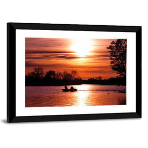 This canvas artwork depicts a serene sunset over water, showcasing a boat with people. Its warm palette of oranges, reds, and purples conveys a peaceful atmosphere, making it a wonderful addition to any room decor.
