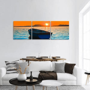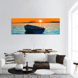A lone blue fishing boat rests on calm water beneath a warm sunset, with distant mountains and a rule-of-thirds composition. Soft orange and blue tones create a tranquil, peaceful atmosphere. The modern seascape suits contemporary or coastal-inspired rooms looking for serene wall decor.