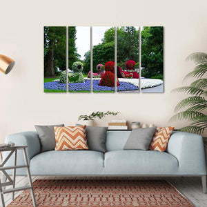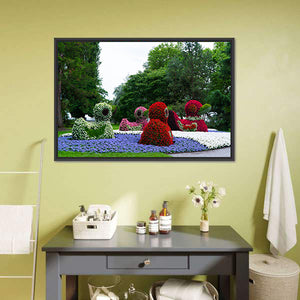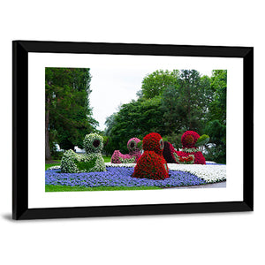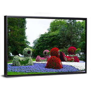 This vibrant canvas features whimsical floral sculptures of ducks amidst a garden of colorful flowers. The cheerful design brings a touch of nature's charm to any space, making it a delightful addition to your decor.