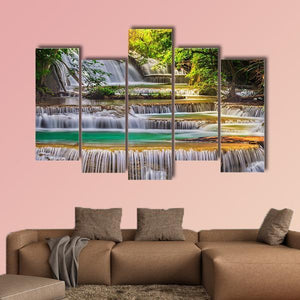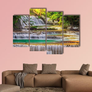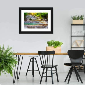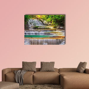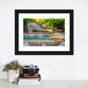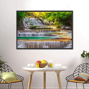 Erawan Waterfall, Thailand captures a multi-tiered cascade and turquoise pools set within lush green forest. This photorealistic landscape print shows sunlight filtering through the trees, creating a serene yet vibrant natural mood. Pair it with living room, bedroom, or modern nature-themed décor.