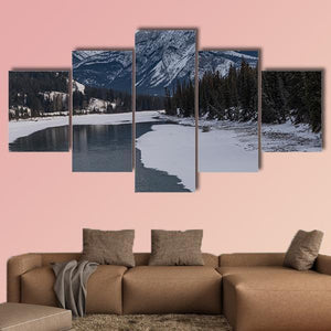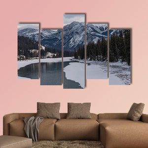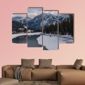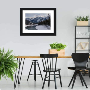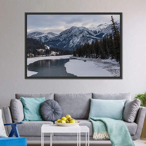 This canvas depicts snow-capped peaks, a partially frozen river and a band of pine forest beneath an overcast winter sky. Its realistic, cool palette of blue, gray, white and green creates a serene, majestic mood that suits modern interiors and nature-focused rooms.