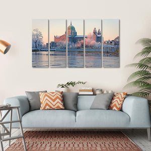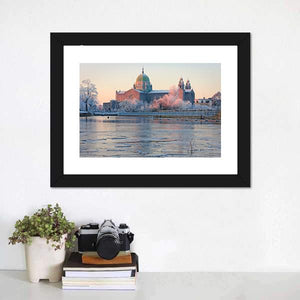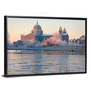 This artwork features Galway Cathedral surrounded by a serene winter landscape. The icy river and frosted trees complement the majestic domed roof, creating a tranquil atmosphere that invites reflection.