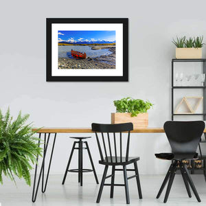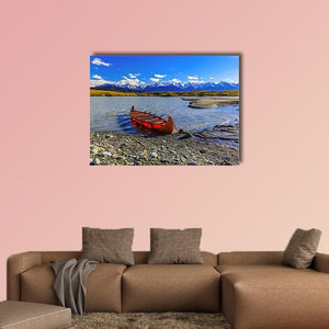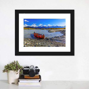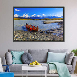 Explore the tranquil beauty of nature with our Glacial Lake Of Davidson canvas art. Featuring a vivid red canoe set against the backdrop of snow-capped mountains under a cloudy sky, this piece evokes a serene and peaceful atmosphere, perfect for any space.